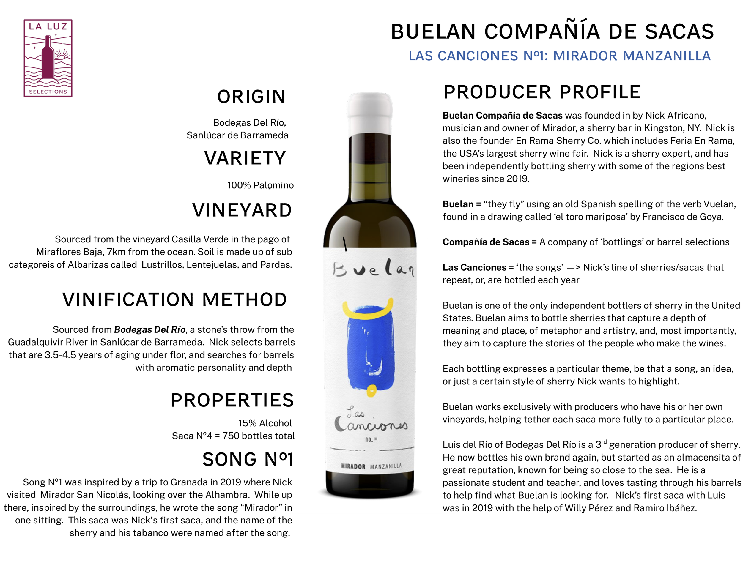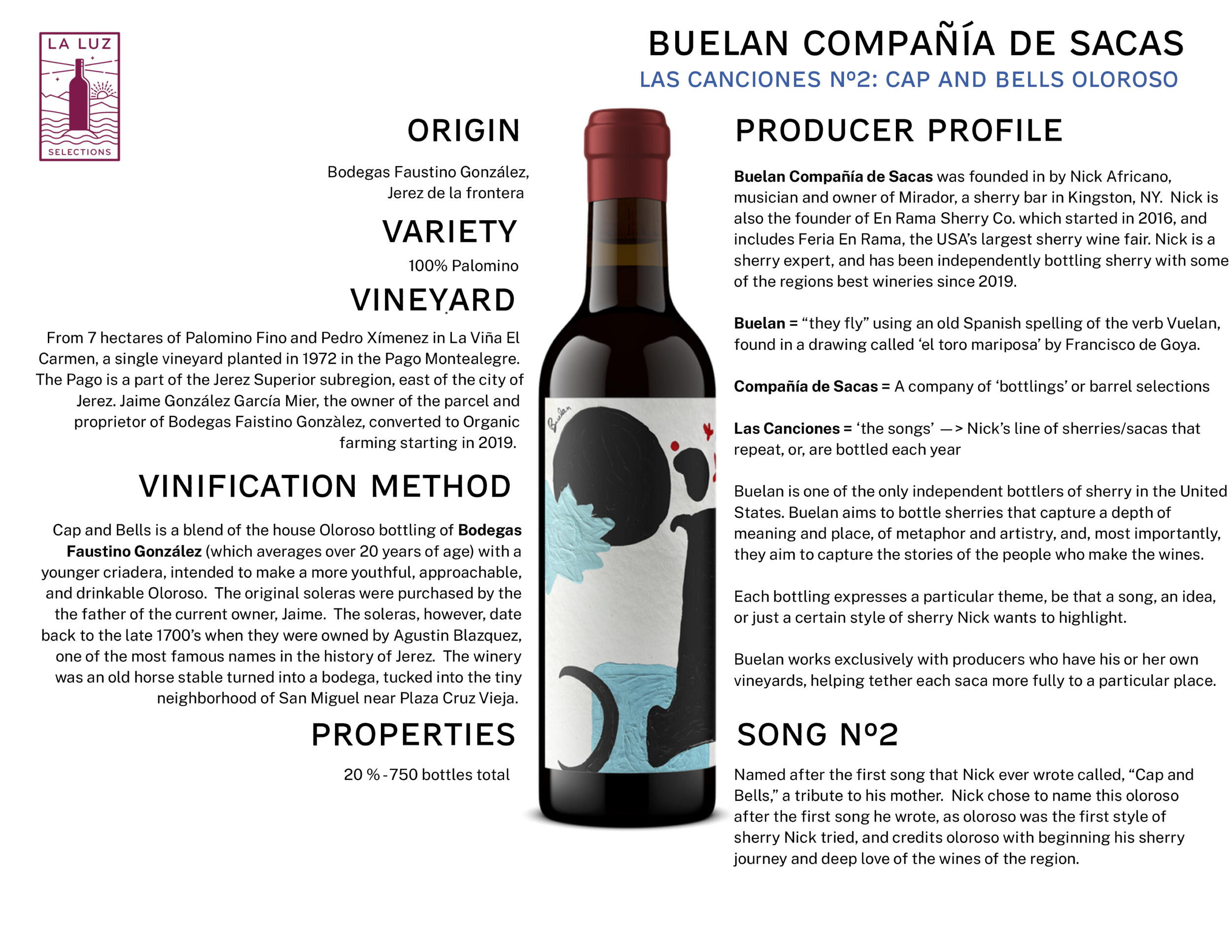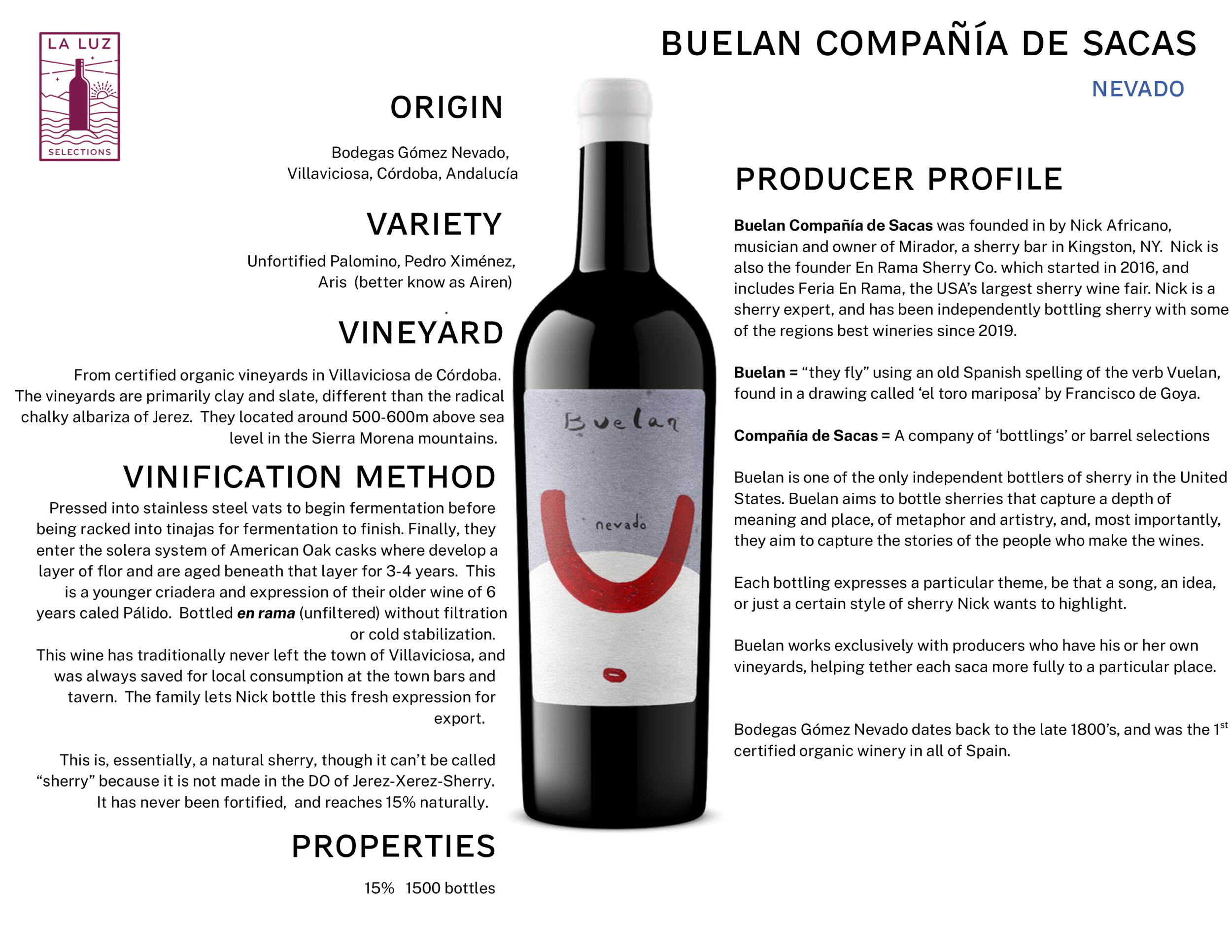 Buelan Compañía de Sacas is a bottling project of barrel selected sherries created by musician and founder of En Rama Sherry Co. Nick Africano.